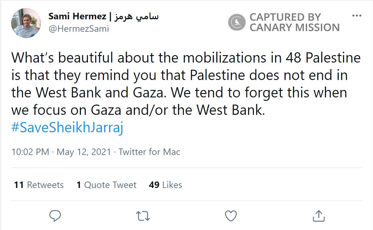 On May 12, 2021, Hermez tweeted, referring to the Arab citizens of Israel: “What’s beautiful about the mobilizations in 48 Palestine is that they remind you that Palestine does not end in the West Bank and Gaza. We tend to forget this when we focus on Gaza and/or the West Bank. #SaveSheikhJarraj.”