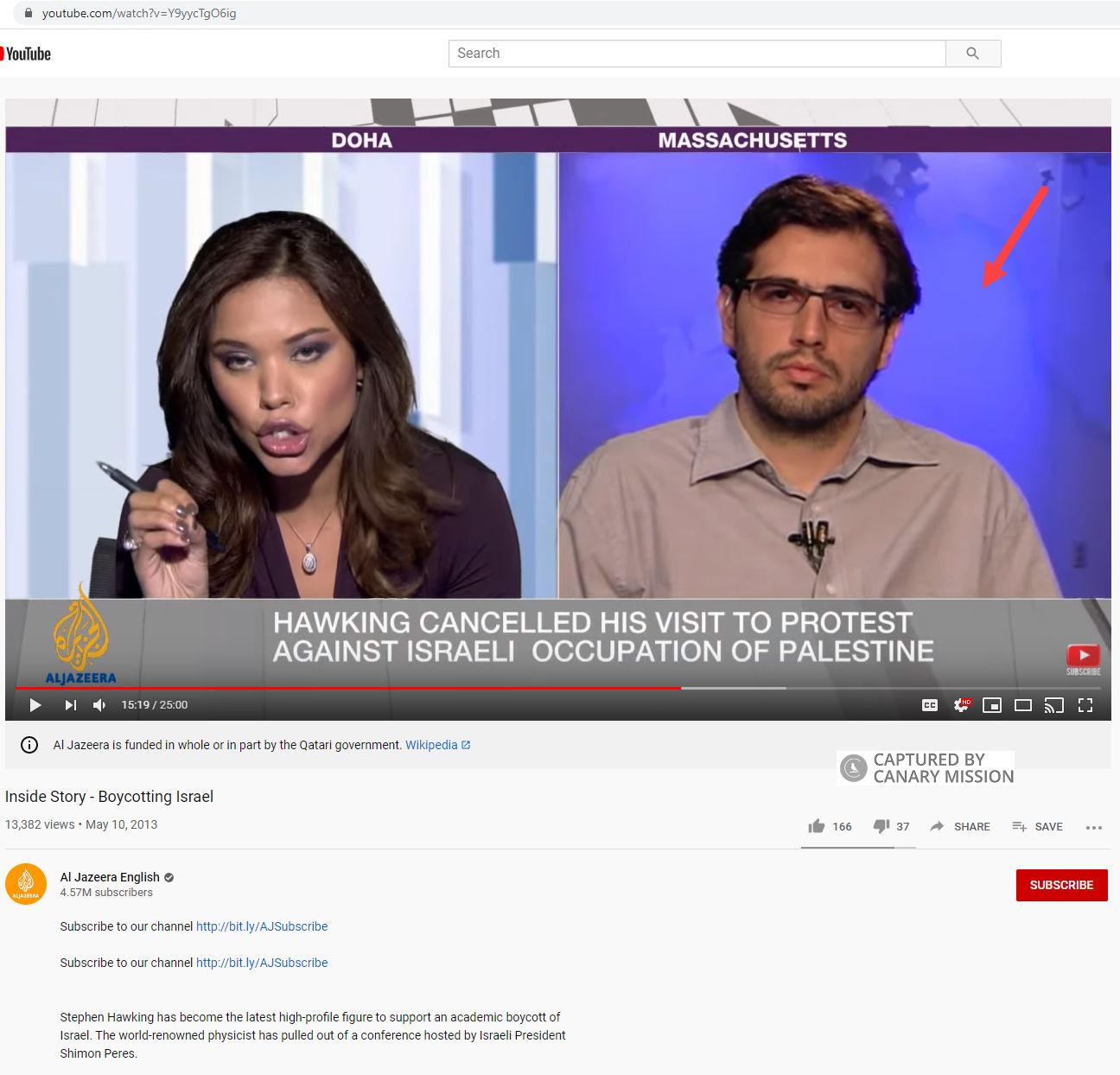 On May 10, 2013, Hermez was quoted in an Al Jazeera English (AJ English) article celebrating the decision of physicist Stephen Hawking to boycott a conference held in Israel.