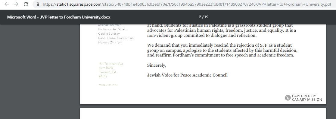 The petitioners also highlighted SJP’s BDS activity, characterizing SJP’s efforts to promote anti-Israel boycott as part of “a time-honored non-violent mode of political expression.” The petition accused Fordham’s administration of a “fundamental misunderstanding of what boycotts are, the purpose of a university, and the goals of SJP.”