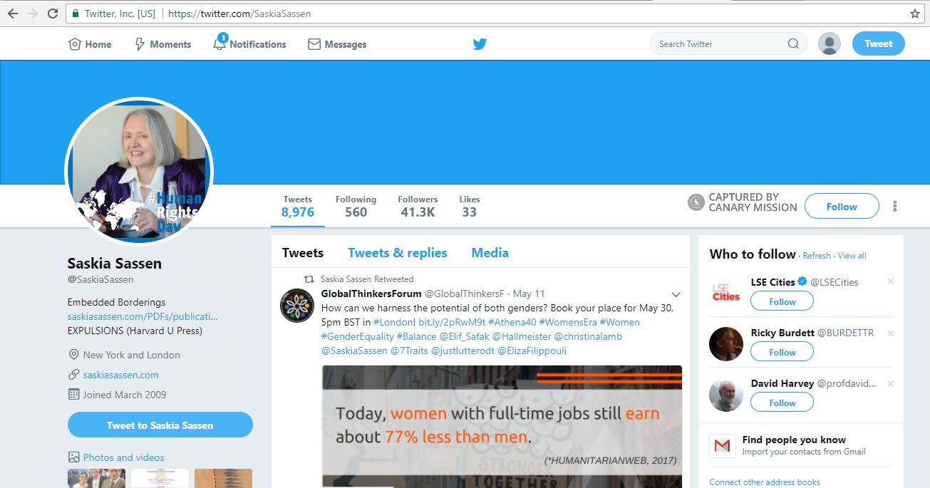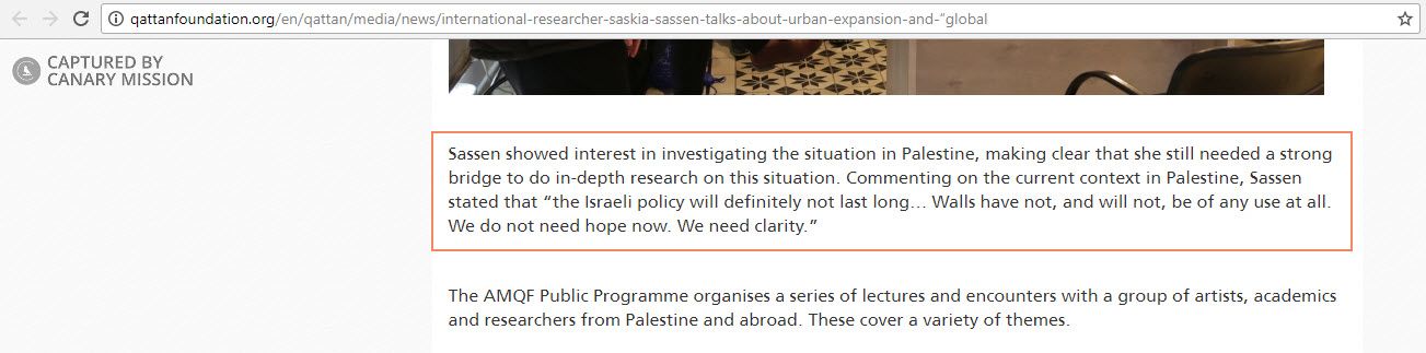On May 3, 2017, Sassen featured at an event speaking about Urban Expansion and Global Cities. In an article chronicling the event, it was reported that “Commenting on the current context in Palestine, Sassen stated that ‘the Israeli policy will definitely not last long… Walls have not, and will not, be of any use at all.’”Sassen signed a statement, published on August 12, 2014 by “American Muslim organizations, academics, Imams, community leaders and activists” who wished to “affirm our unequivocal support for Palestinian rights to freedom and dignity while forcefully condemning the illegal and oppressive occupation structure.”