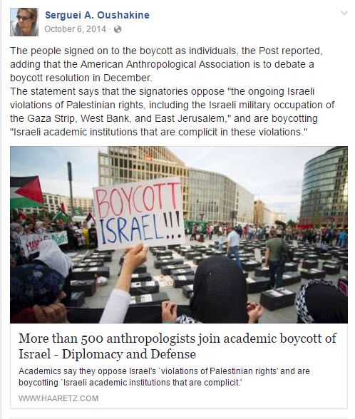 Serguei Oushakine [Serguei A. Oushakine] supports the Boycott, Divestment, Sanctions (BDS) movement at Princeton University (Princeton), where he is an associate professor of Anthropology and Slavic Languages and Literatures, as well as the director of the Program in Russian and Eurasian Studies.In an October 22, 2015 Facebook post, Oushakine encouraged the American Anthropological Association (AAA) to boycott Israeli academic institutions. In June of 2016, the AAA announced that a resolution to boycott Israeli universities was defeated, but that there are “other actions planned.”