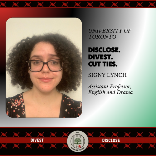 UofT assistant professor Signy Lynch showed support for the encampment by signing on to a statement put out by UofT community members in May 2024 [row 46, first photo]. The May 20, 2024 statement was part of the Boycott, Divestment, Sanctions (BDS) movement.