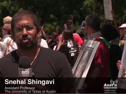 During a November 2014 talk, Shingavi likened Gaza to the Nazi death camps, claiming [00:13:15] that “This is not me being hyperbolic… Gaza is the biggest open air concentration camp in the world today and the condition of life in Gaza is not dissimilar to life in camps in Auschwitz and Dachau.”On August 2, 2014, during Israel’s Operation Protective Edge (OPE), Shingavi spoke [00:03:56]at a “Texas Stands with Gaza” rally, where he alleged that OPE was based on “vicious lies” and that Israeli Prime Minister Benjamin Netanyahu “sent out lynch mobs where people roamed the streets and caught any Arab they could.”