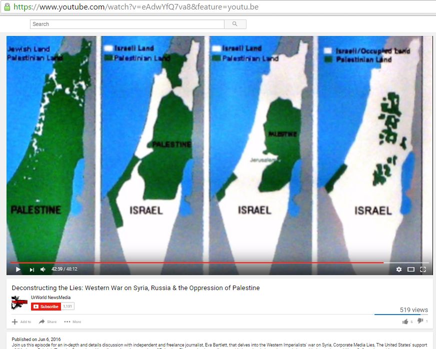 Comissiong also displayed (42:18) a fraudulent map that showed lands that were controlled by Britain, Egypt and Jordan as autonomous “Palestinian Land,” stolen by Israel.