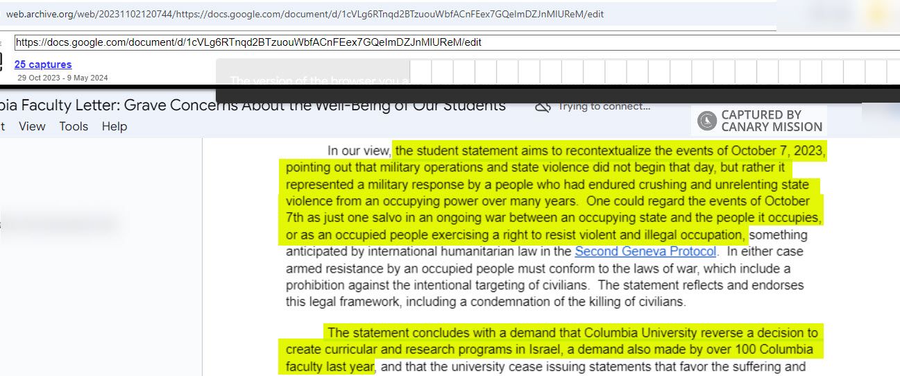 The letter Proudfoot signed also defended [p. 9] the Columbia students who had signed on to their joint statement, claiming the students’ document “situated the military action begun on October 7th within the larger context of the occupation of Palestine by Israel.”