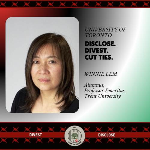 As of July 2024, Winnie Lem, a “Professor Emeritus [sic]” at Trent University (Trent), had shown support for the encampment by signing on to a statement put out by UofT community members. The May 20, 2024 statement was part of the Boycott, Divestment, Sanctions (BDS) movement.