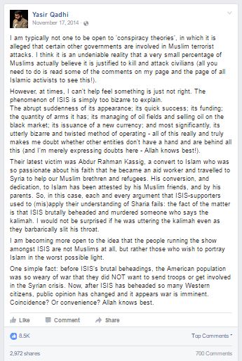 On November 17, 2014, Qadhi suggested on Facebook that the United States and other Western governments were behind the rise of ISIS.