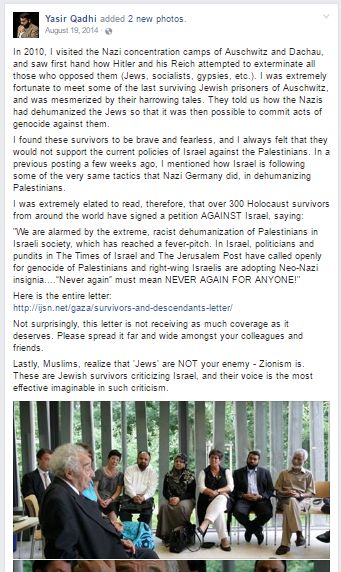 On August 2, 2014, Qadhi said, on Facebook: "Truly amazing that a nation that claimed 'Never Again!!' is willing to itself do it again." The phrase “Never Again” is a reference to the attempted Nazi genocide of the Jewish People.