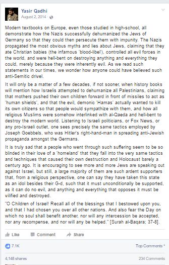 In an August 2, 2014, Facebook post, Qadhi specifically likened Israel supporters — and Israelis — to Nazi propagandist Joseph Goebbels.
