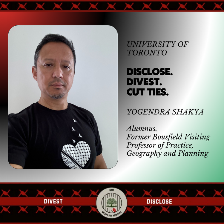 On October 12, 2023, Shakya tweeted at U of T’s Department of Geography and Planning and School of Public Health: “@geo_UofT @UofT_dlsph , it will be great if you can release a similar statement in support of faculty and student groups providing critical analysis on Palestine/Israel.”